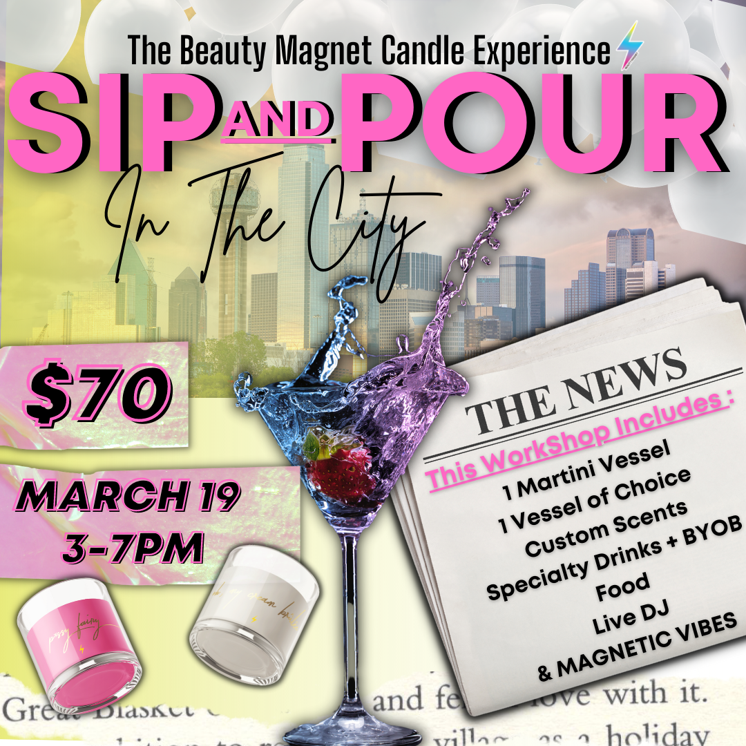 Here at Sip & Pour brought to you by The Beauty Magnet , we welcome all Candle Lovers that are beyond ready to experience The Beauty Magnet & Candle Making in the City of Dallas to make a statement that Not Only are we Slanging the best candles in the City you can experience it for yourself 😉.